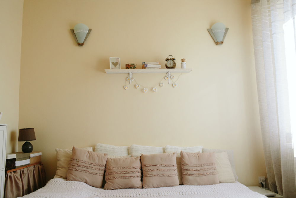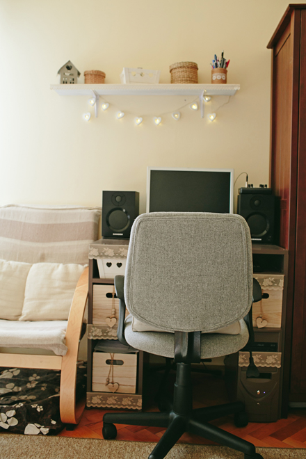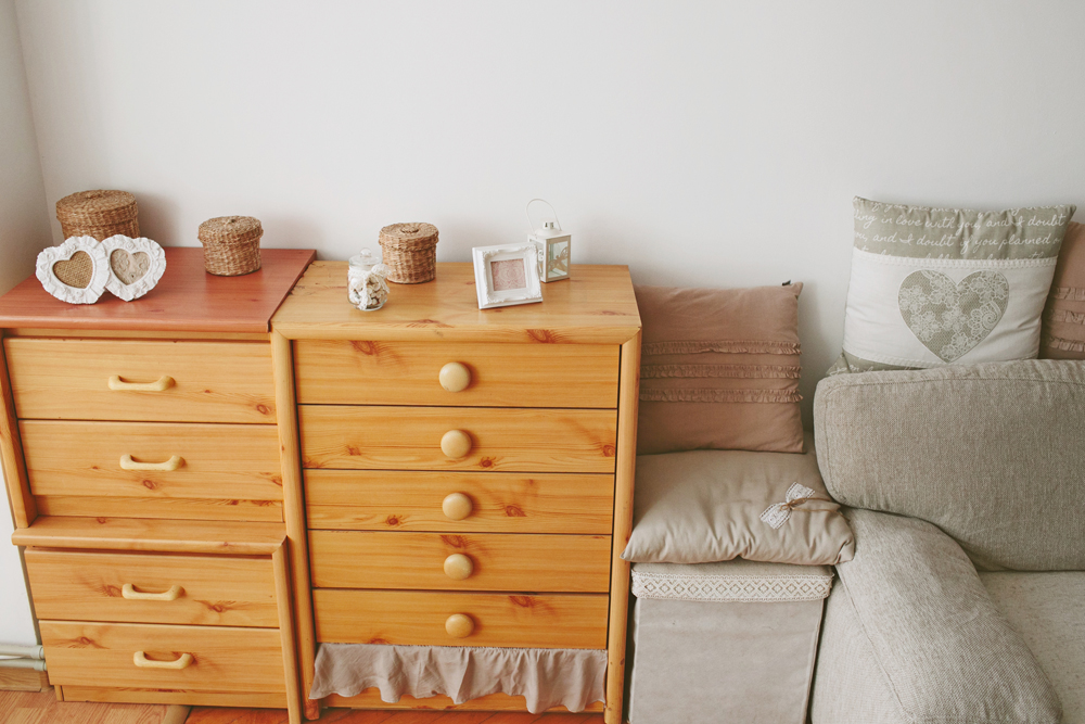 Borcanele și cutiile învelite în sfoară și dantelă de aici și din dormitor sunt realizate manual de proprietară.