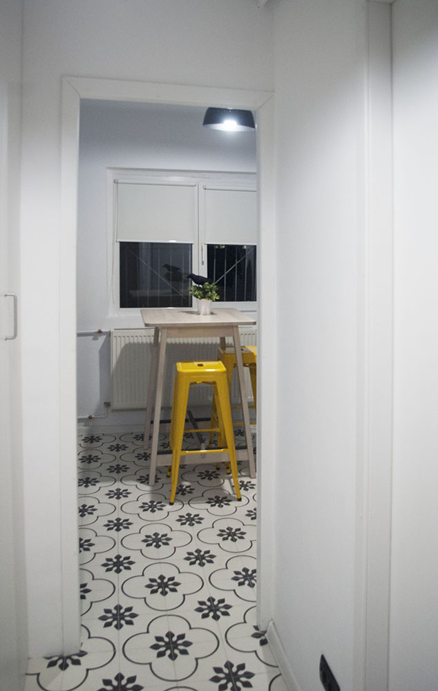 Plăcuțele decorative din ciment de la Manolo Manufaktura (baie, bucătărie și hol), împreună cu mobila albă din living echilibrează decorul și permit jocului de contraste, motive și culoare să aducă personalitate interiorului.
